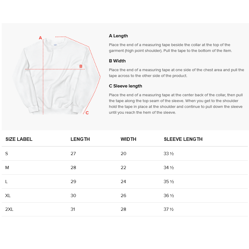 Size chart is in inches.