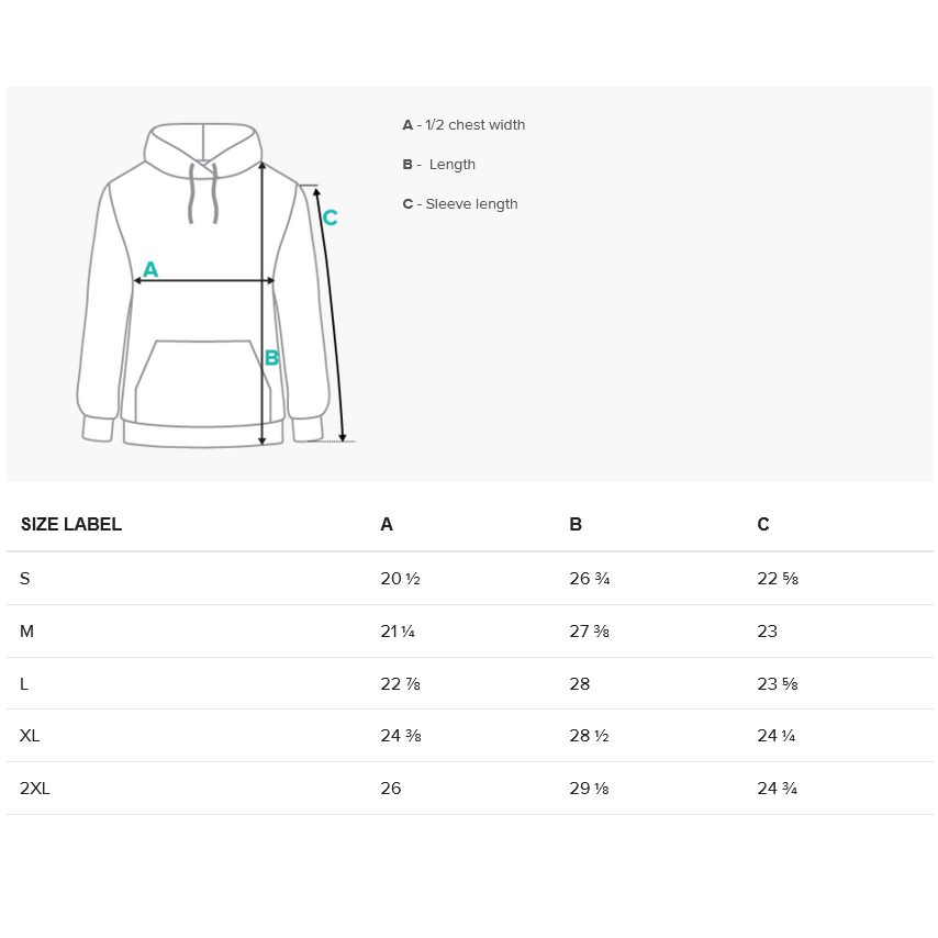 Size chart is in inches.